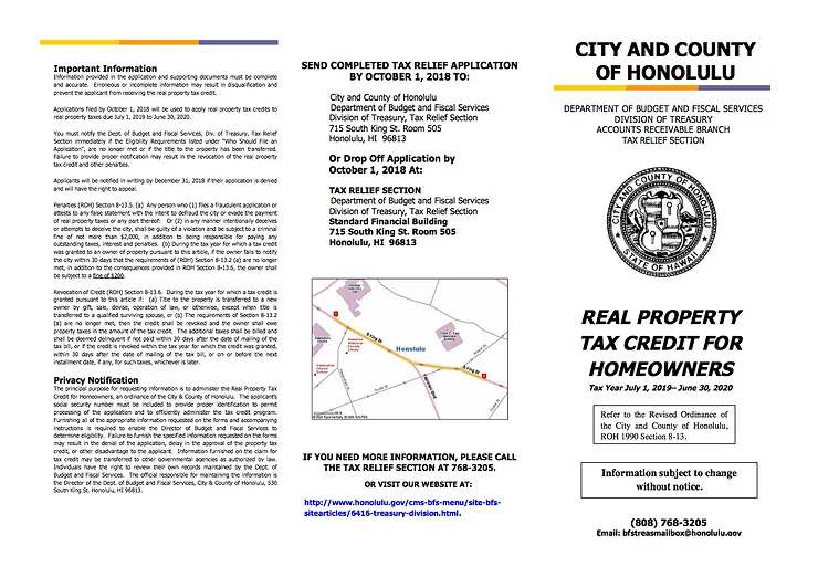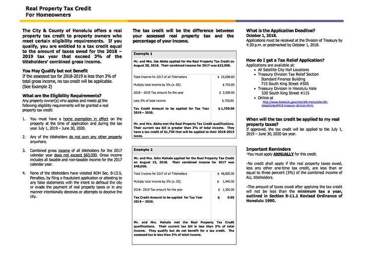 There is a little-known tax benefit for homeowners with Honolulu City & County. Eligible homeowners may receive a tax credit equal to the amount of real property taxes owed or up to 3% of that titleholder's combined gross income. Eligibility requirements include 1) having an owner-occupant exemption in place at the time of application, 2) may not own any other property, 3) combined income cannot exceed $60,000 annually, and 4) must apply annually.